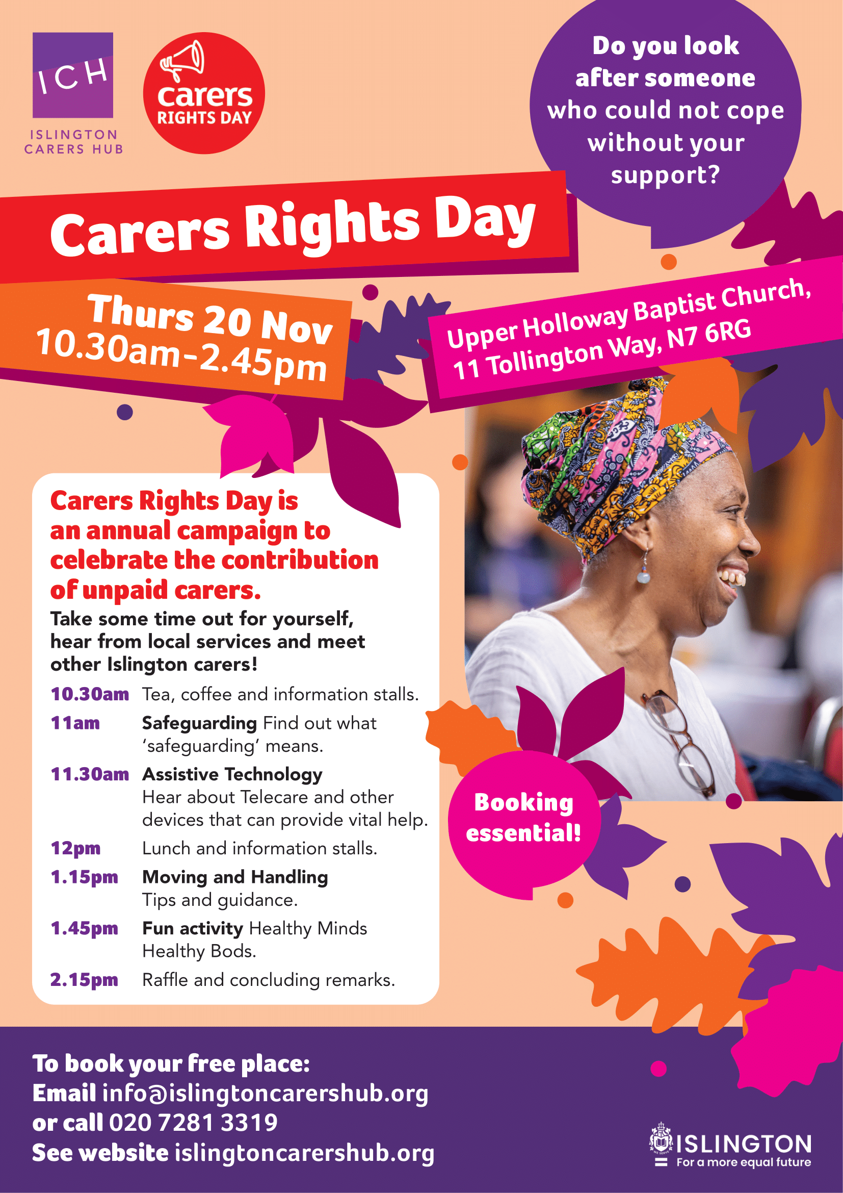 | What’s happening on the day Talks from local services offering practical support and advice A delicious lunch and refreshments A fun activity to help you relax and recharge Meet other carers, chat with local services and members of the Carers Hub team Booking is essential via info@islingtoncarershub.org or call them on 020 7281 3319 (Mon to Fri 9am – 5pm). |